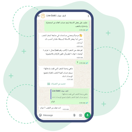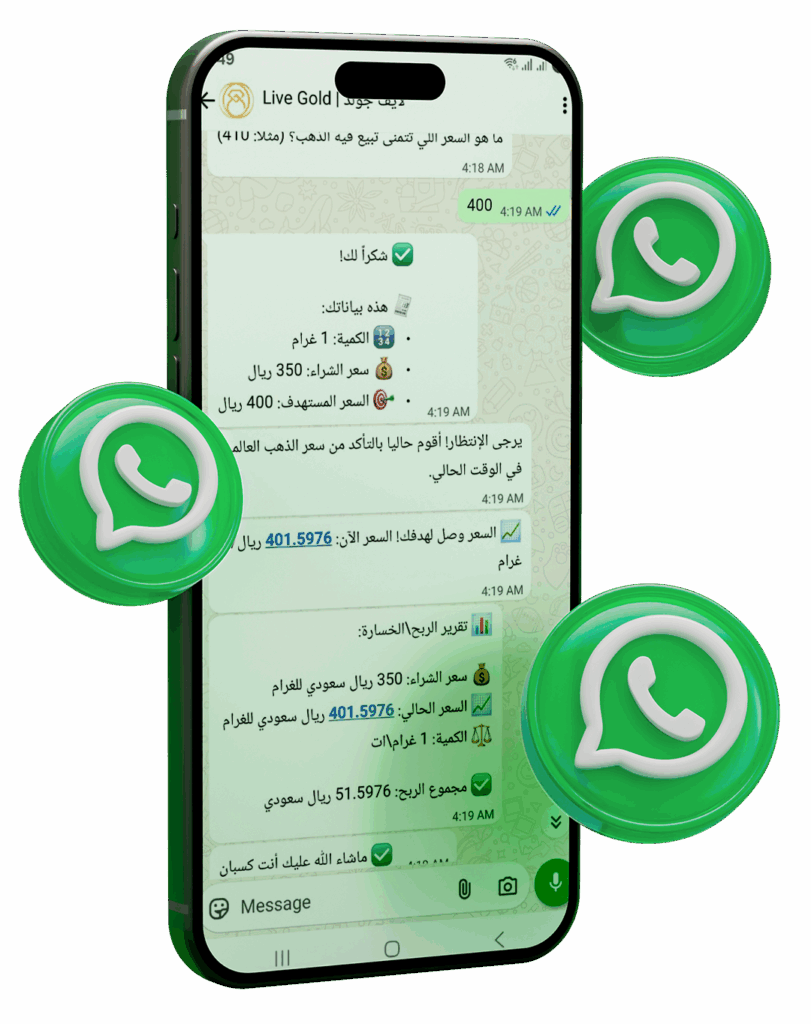 تنبيهات ذكية توصلك مباشرة على الواتساب وتحلل وضعك تلقائيًا وتوصلك على واتساب مباشرة، بناءً على سعر الذهب اللي شريته وكمية الذهب اللي تملكها.